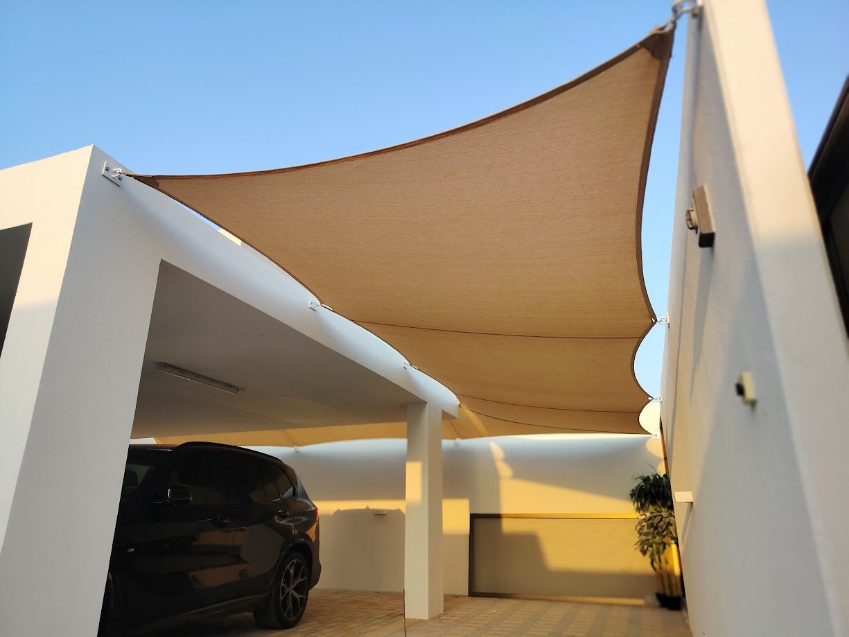 Marhaba Tent & Awnings designs and installs durable shade structures including car parking shades, pergolas, tensile structures, and outdoor awnings for residential and commercial spaces across the UAE.